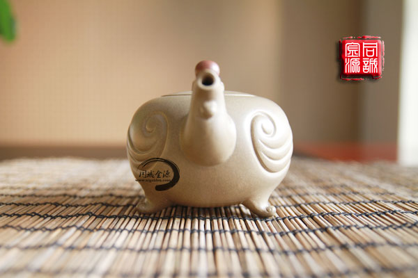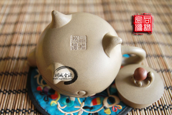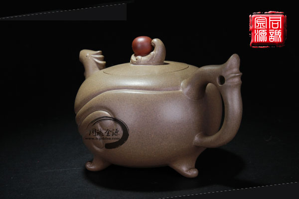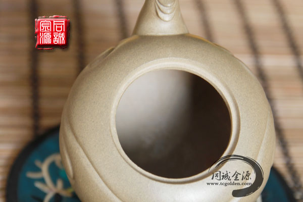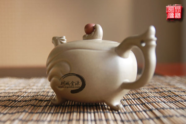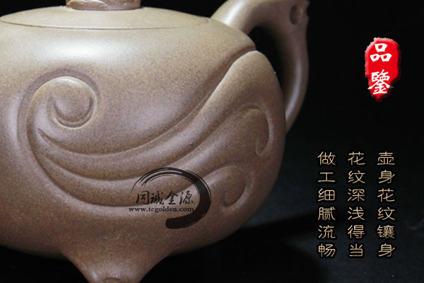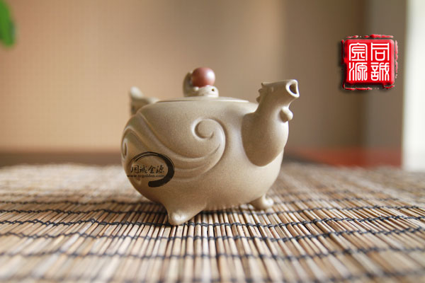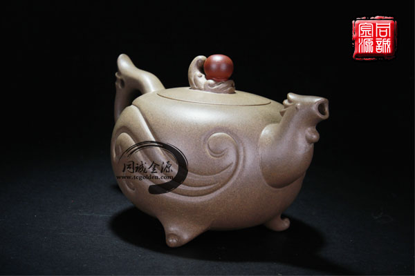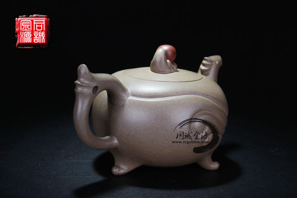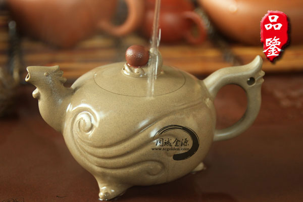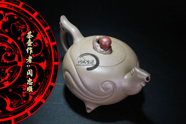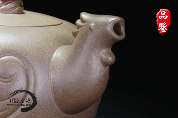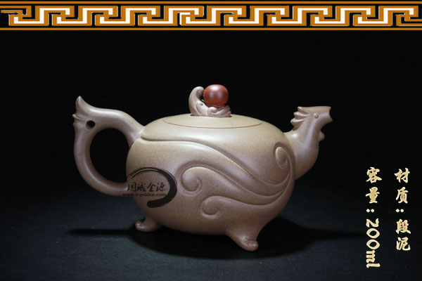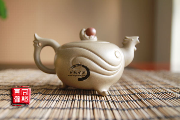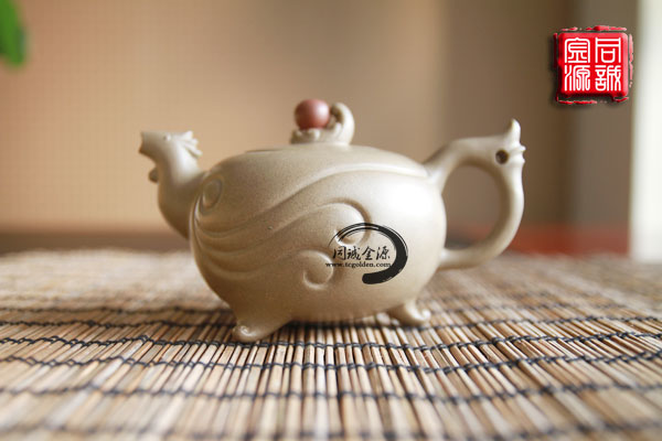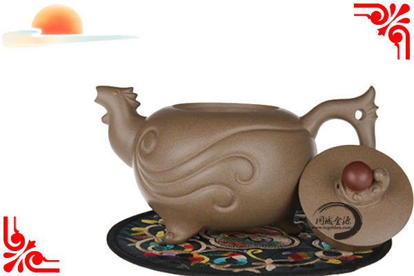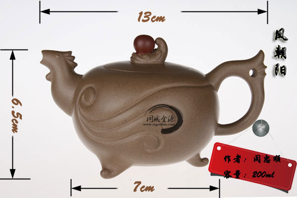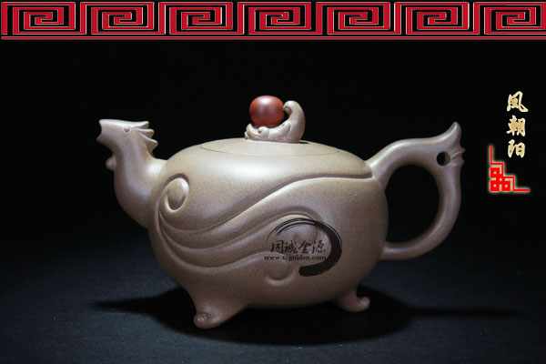 此壶凤朝阳,采用精选缎泥烧制而成,整体细腻柔和,手感光滑。从造型方面着手,此壶造型独特,是传统吉祥物凤凰。壶身是凤凰的身体,圆润饱满。壶嘴采用一弯嘴流式,是凤凰头部,昂首挺立朝向朝阳。壶盖采用不露痕迹的嵌入式,保持了壶身的完美整齐。壶钮为配合壶的整体感 觉,作者也动了一番心思,傲然挺立的羽翼上拱着一颗珠子,这样既显壶的高贵又显造型的霸气。壶把正好是由凤凰尾巴构成耳状的壶把又有几缕 高耸的羽翼,这样的壶把不仅和整体壶身相融合,更彰显凤凰的高傲与富贵。从壶身延伸出的三个壶足是凤凰的脚,同样是微微翘起傲然挺立。